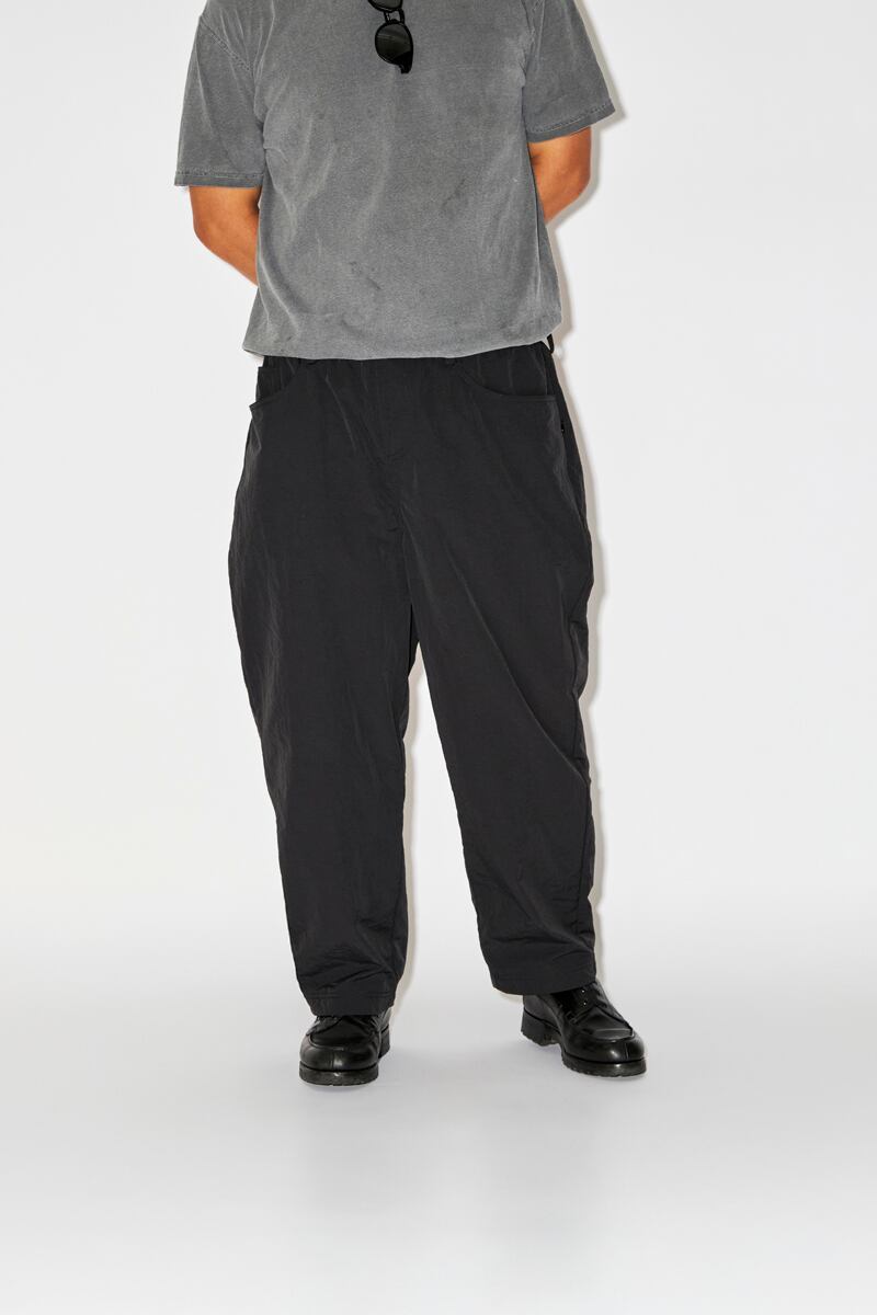 フリーサイズ展開のバギーフィットで、丈は長めに作られており履く人によって少しシルエットが違うのもユニークなパンツです。