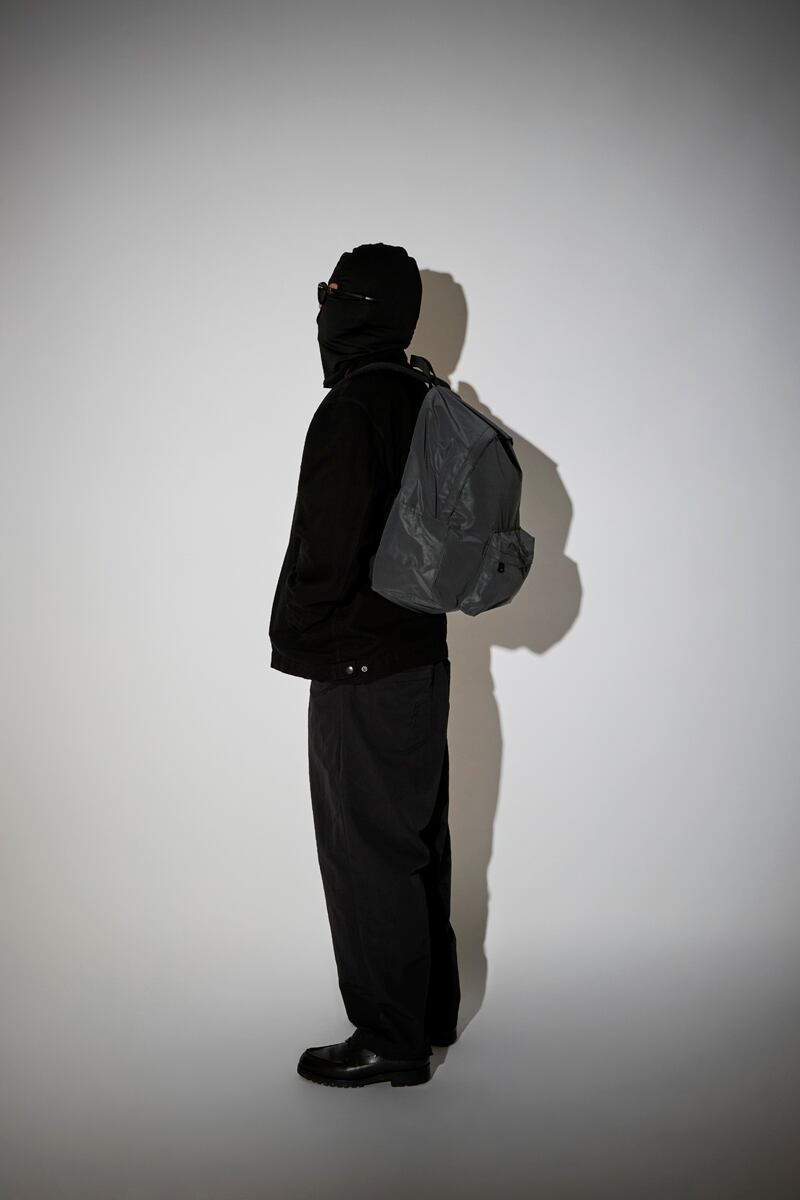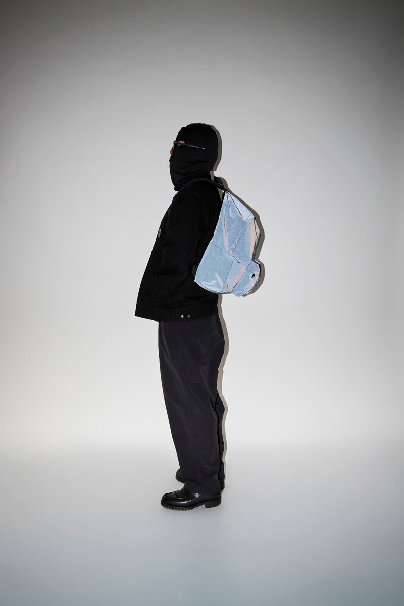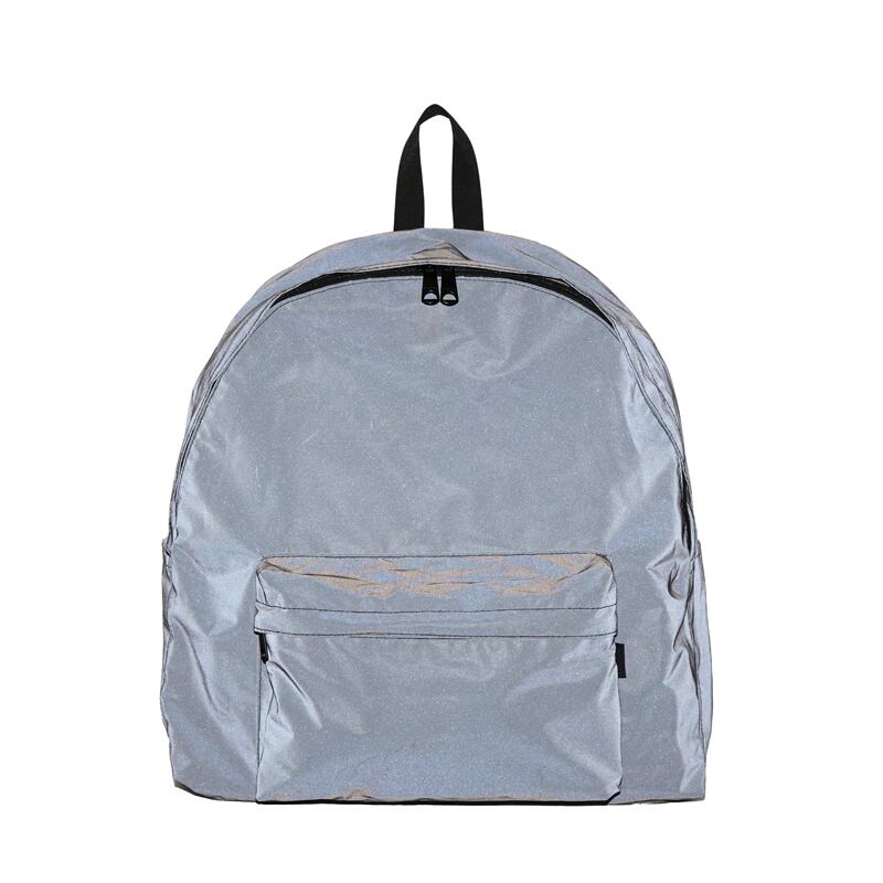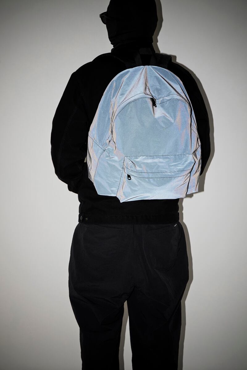 ユニークかつ機能的なブラックの反射素材を使用した大容量のバックパックです。