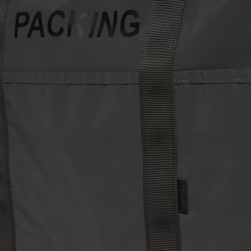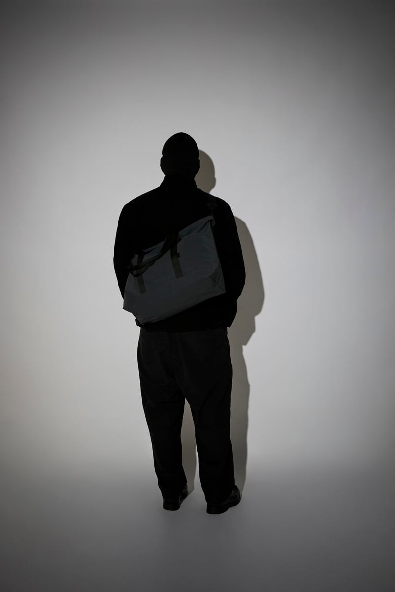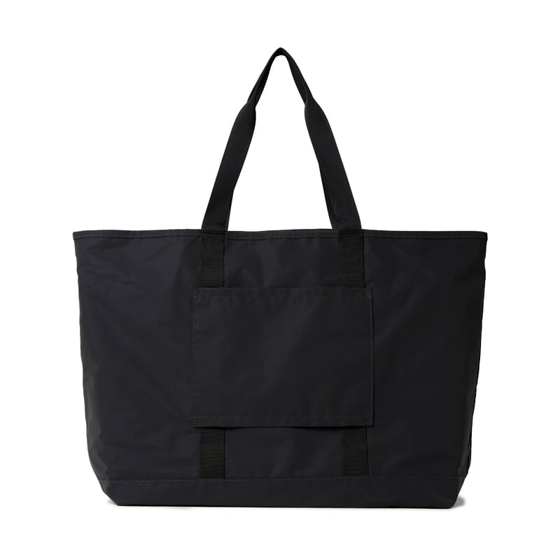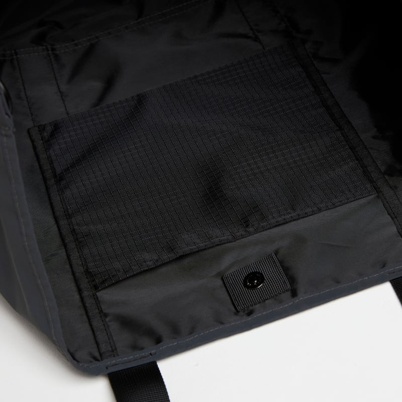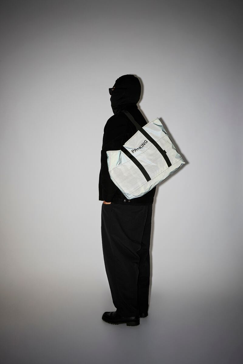 ユニークかつ機能的なブラックの反射素材を使用した大容量のユーティリティトートバッグです。