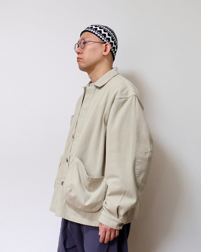 エルボーパッチに袋状の独特なポケット、ボタンや背中のハンガーループ等の細部にこだわりが有ります。