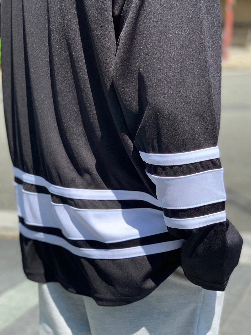 クラシックなホッケージャージの形で、ボディと袖に入った太めのライン入りです。