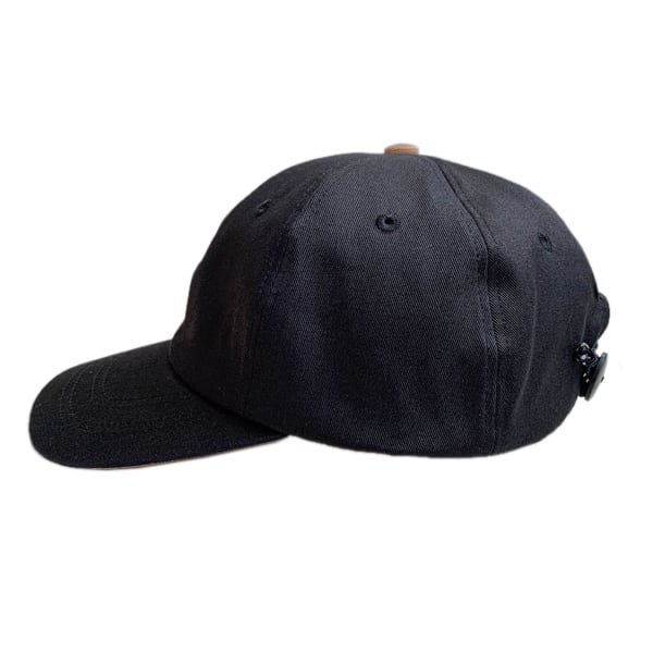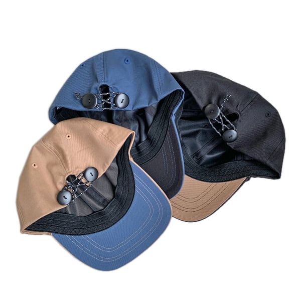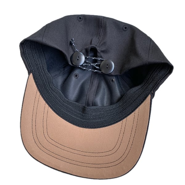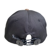 バックのアジャスターにはキャップでは見た事が無い、丸タック留め封筒から着想した2つ穴ボタンとリフレクターになったパラコード によるオリジナルの留め具を使用。