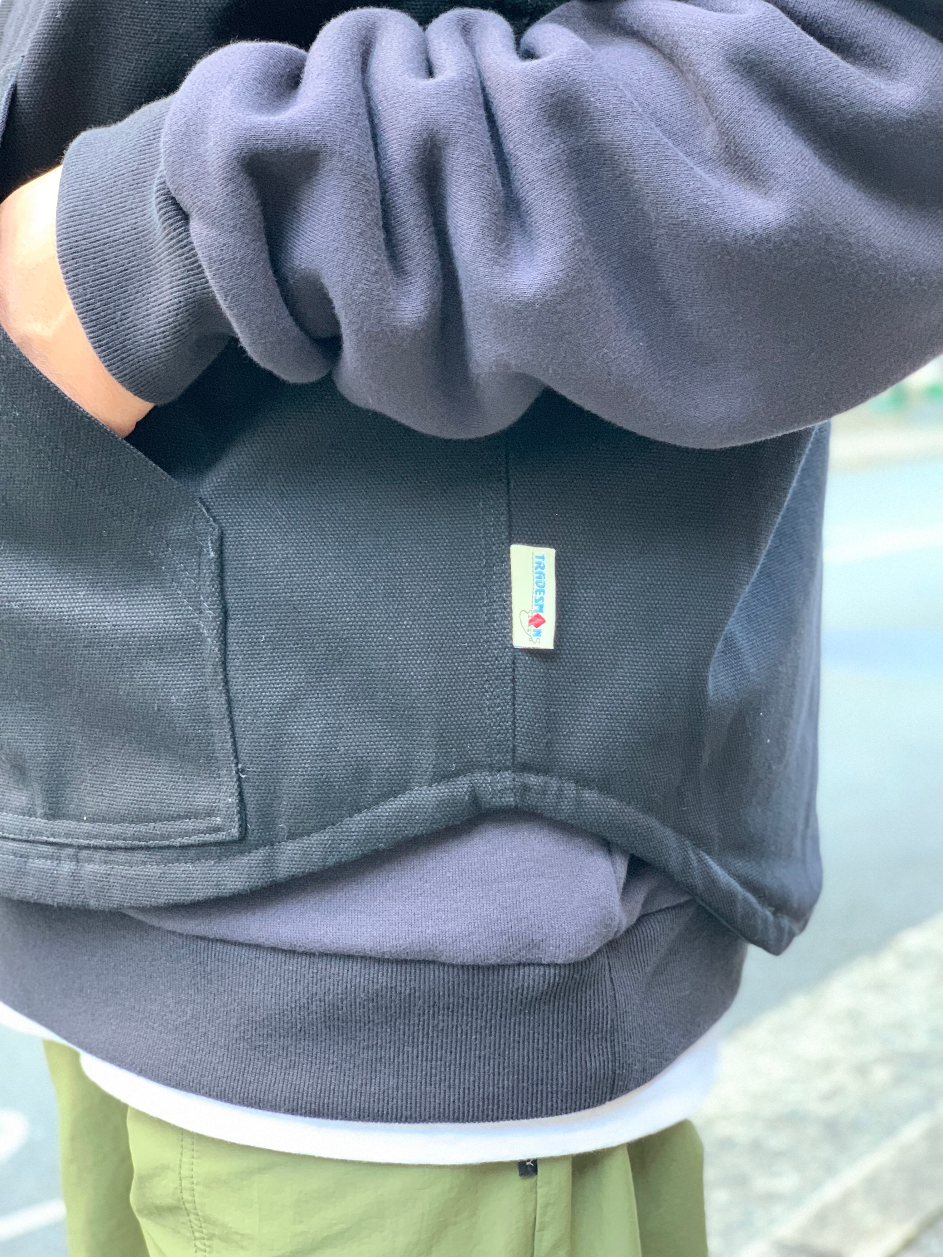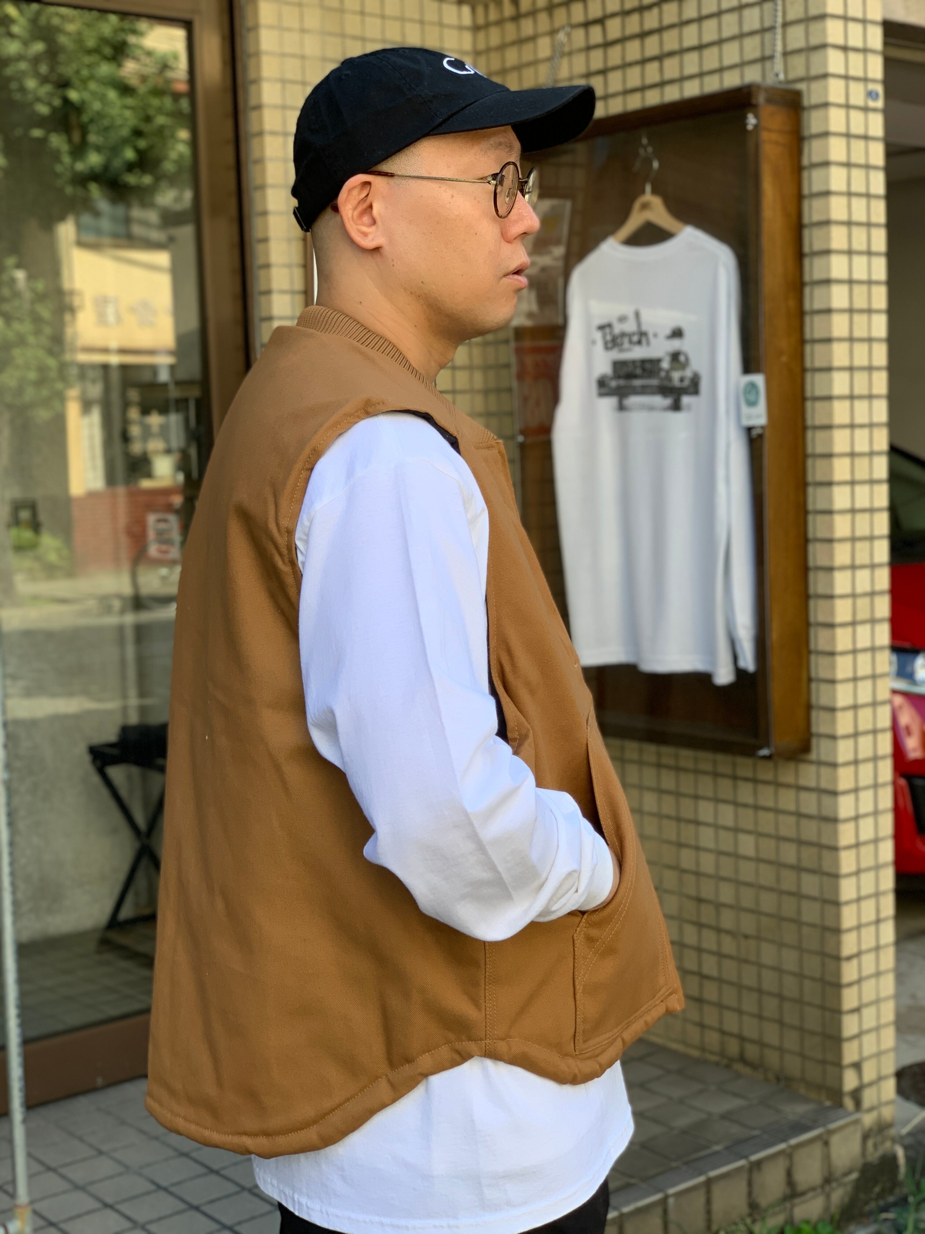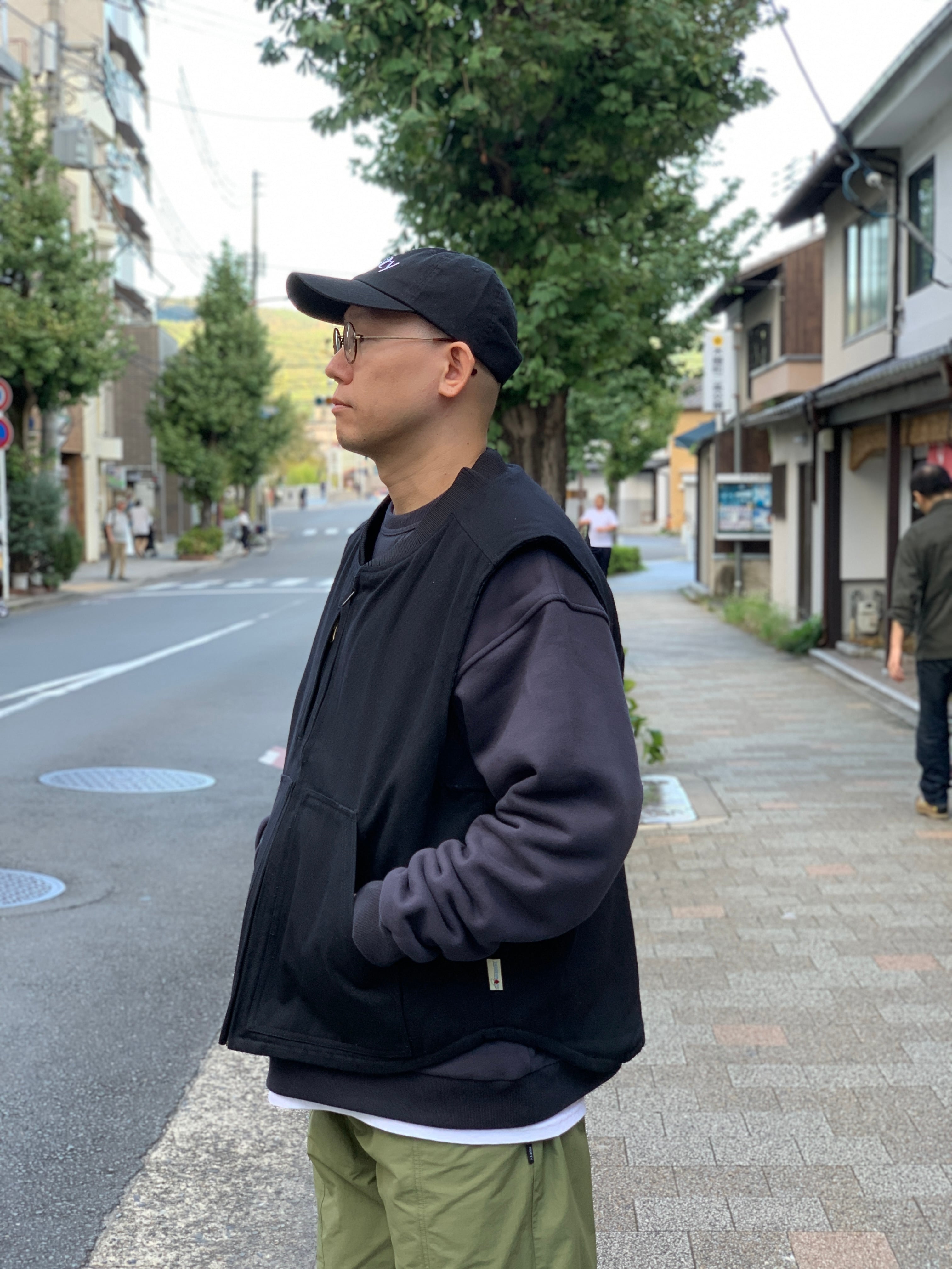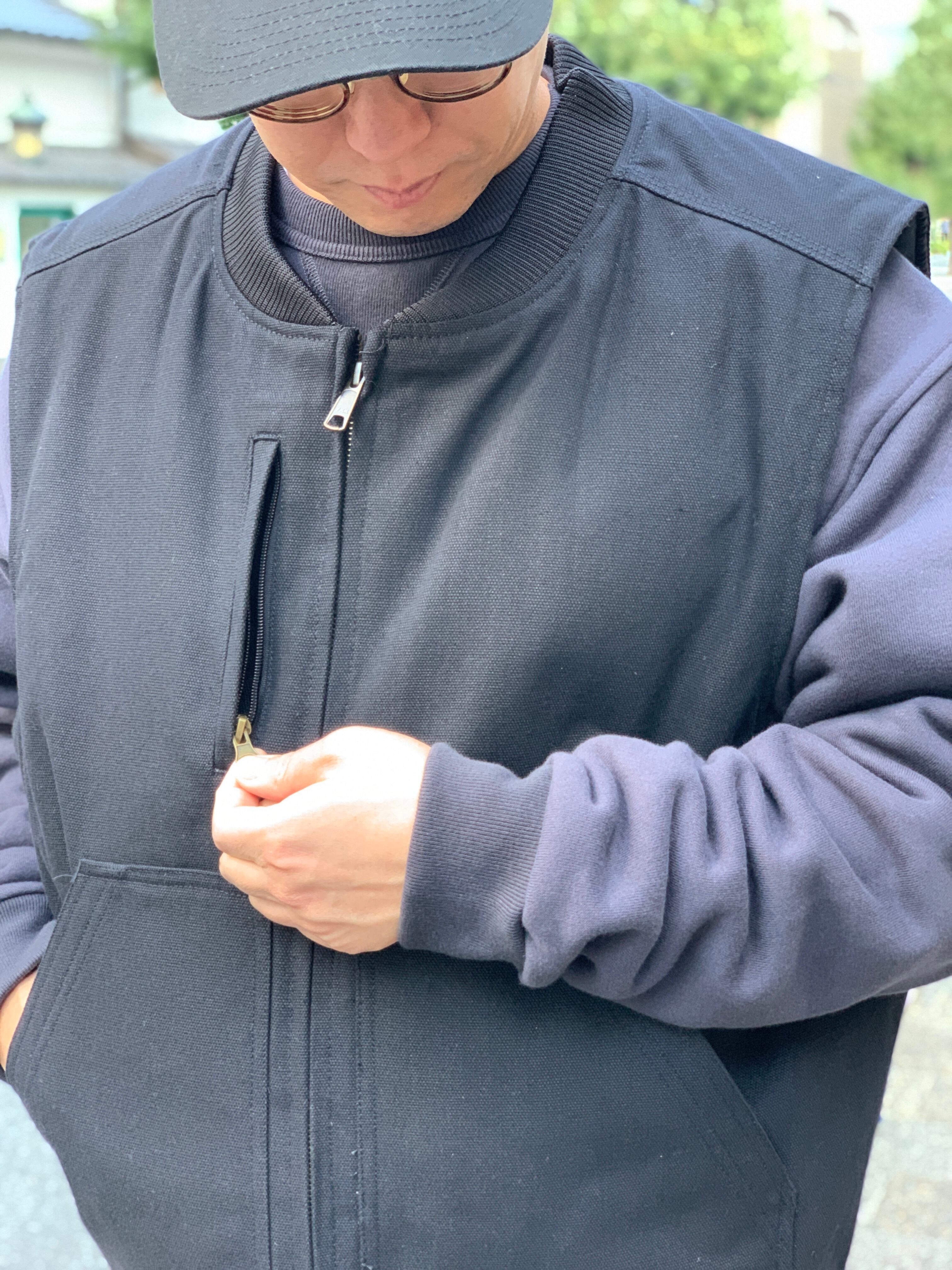 ワークウェアのベストによく有る極端な丈短じゃないので着やすいし、アームホールが広くてスウェット生地のアイテムと合わせやすいと思います。