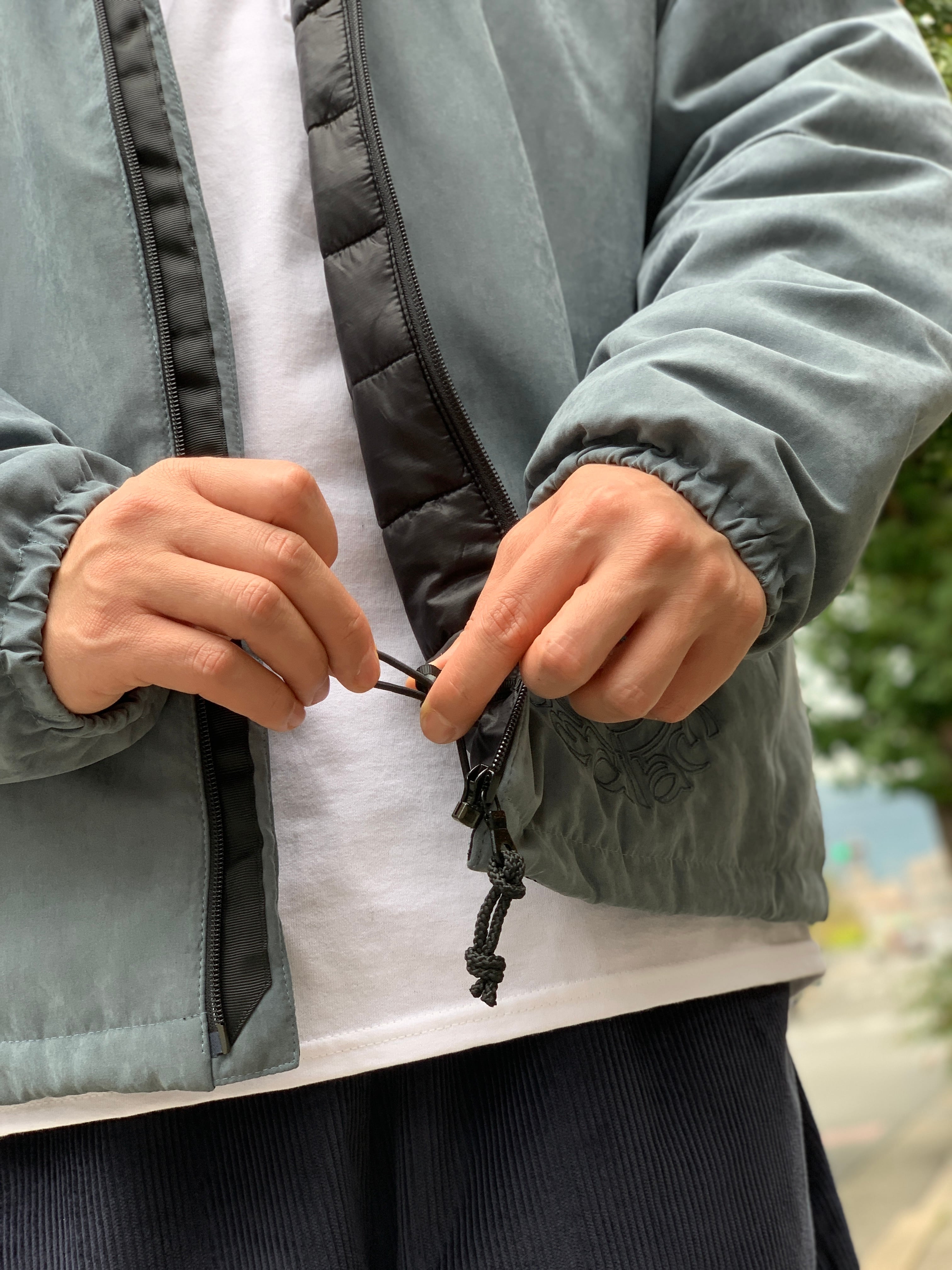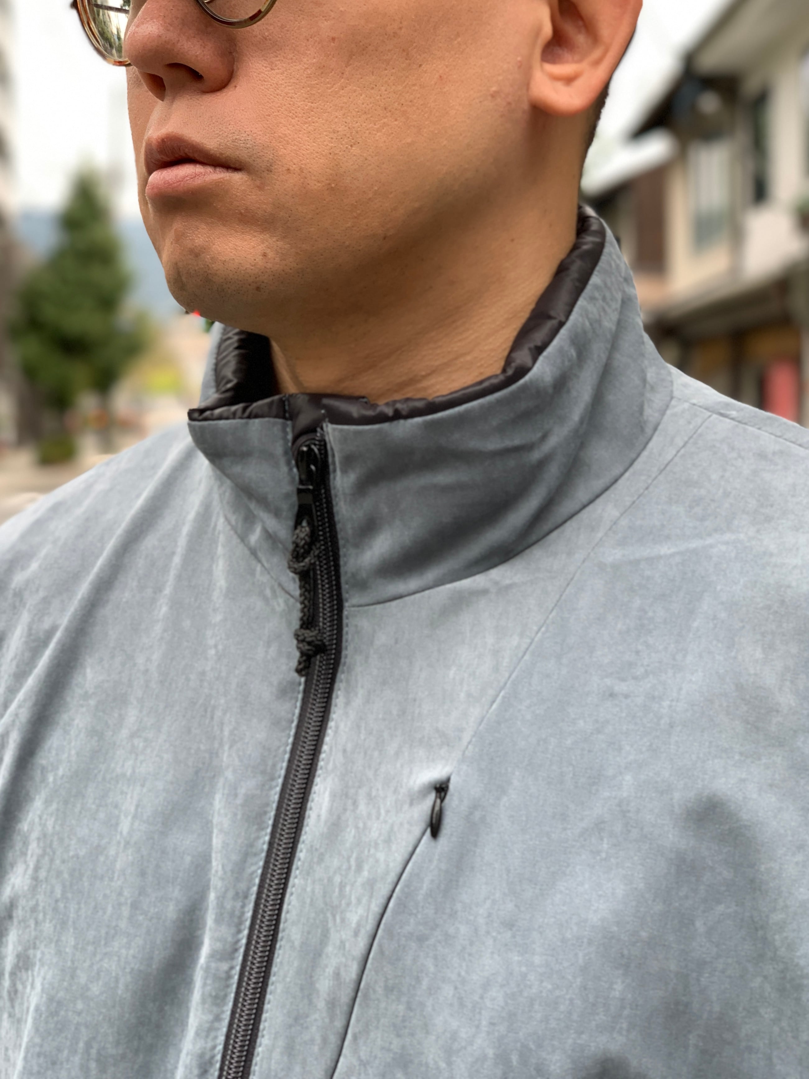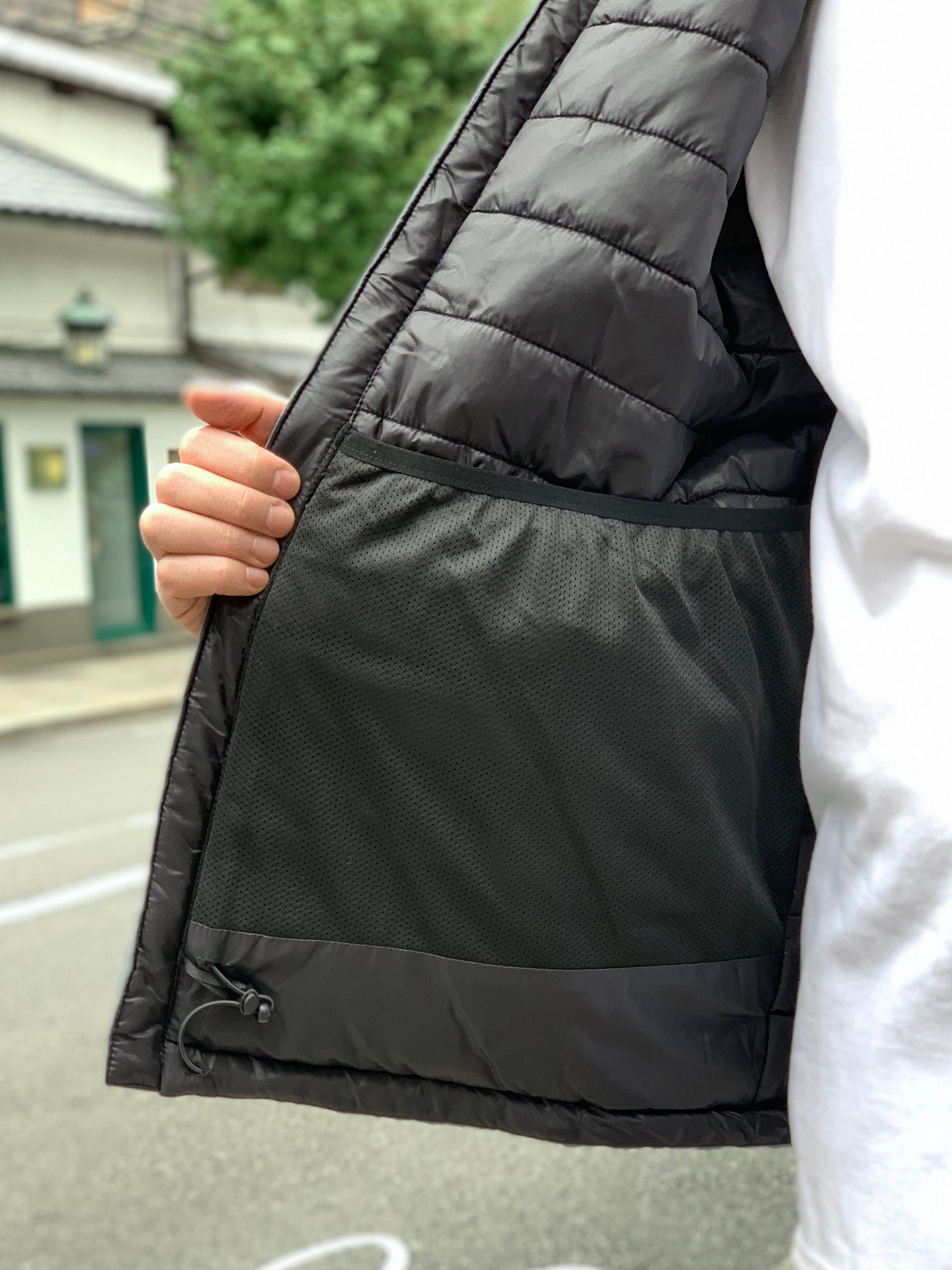 スタンドカラーに、左胸と両サイドにジップポケットと大きめでメッシュになった内ポケットが1つ、裾はゴム製のドローコードで絞れます。
